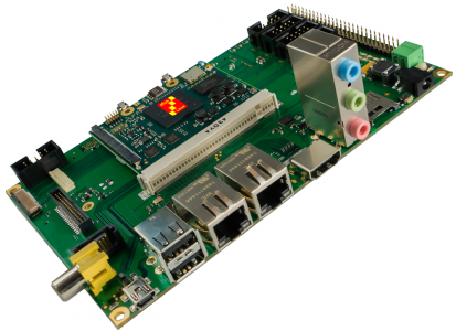 Bietet Anschlussmöglichkeiten für 2x Ethernet, 3x USB Host, USB Device (OTG), micro SD Karte, SD Karte, 4x Seriell, I²C, SPI, 2x PWM, Audio (Line In, Line Out, Mic), digital/analog Kamera, DVI/DisplayPort, mini PCIe und SATA.